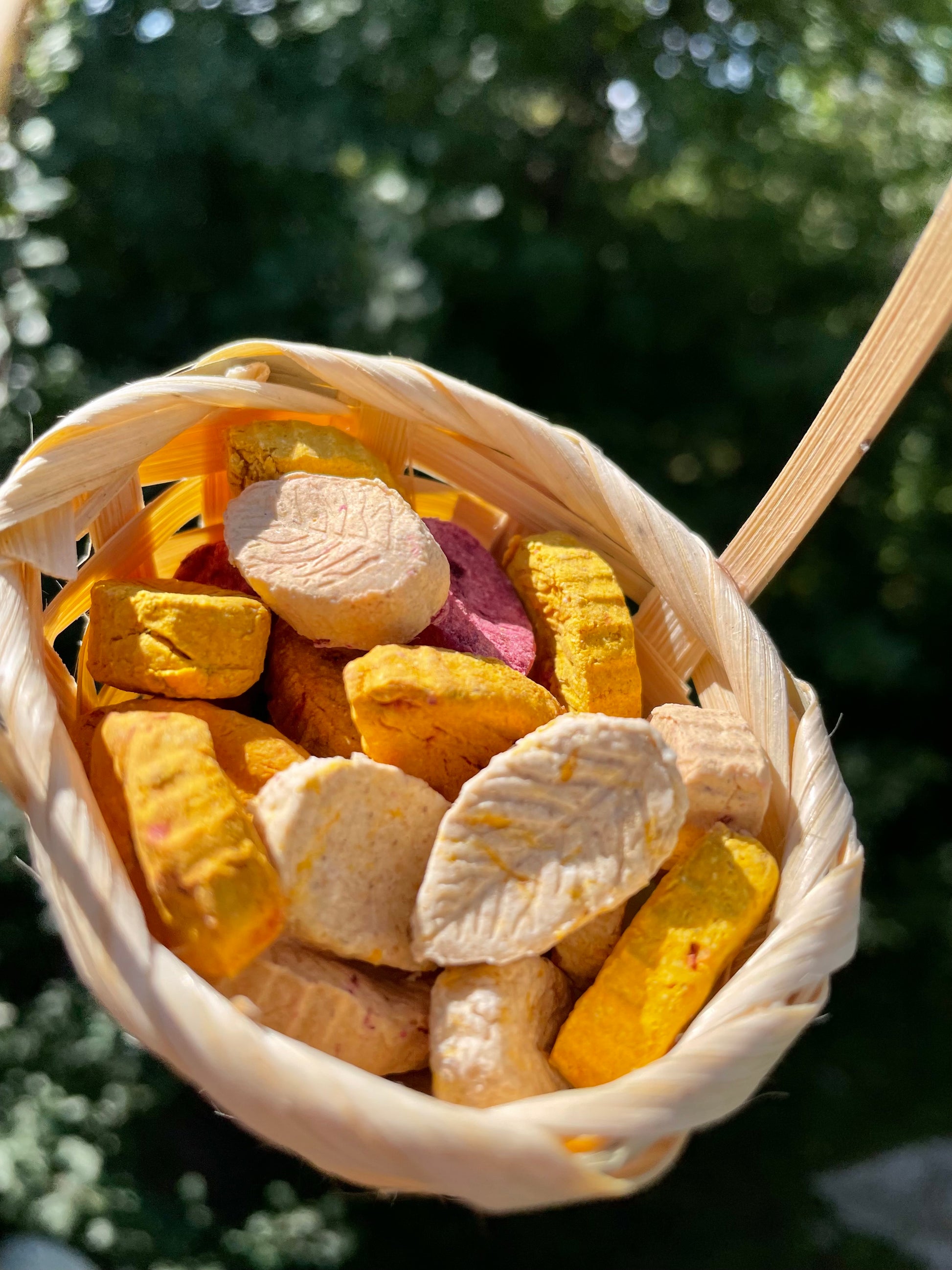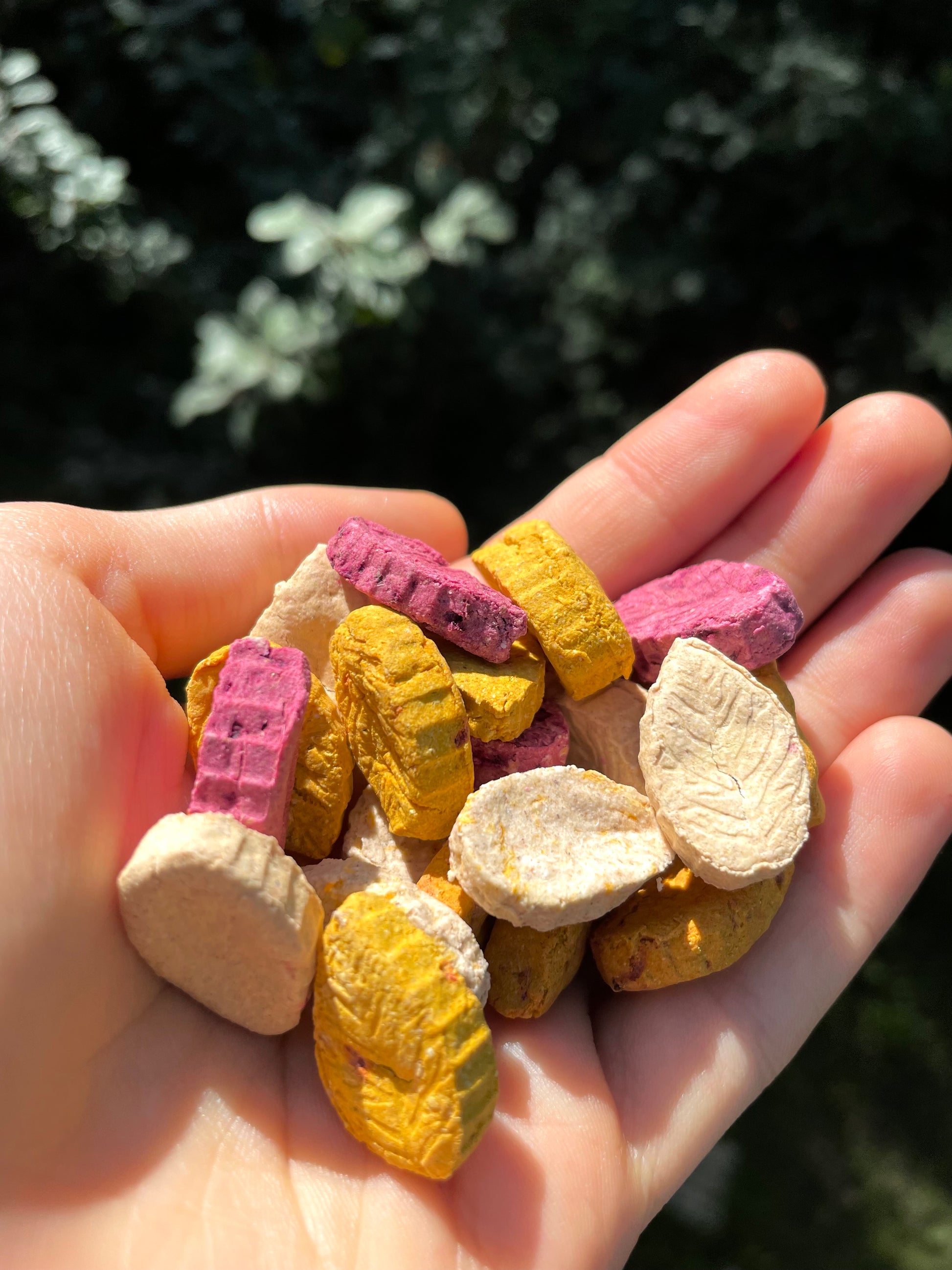 Autumn Leaves are artisanal treats for rabbits (or other small animals), inspired by the flavors of the season. These delightful treats are carefully crafted using natural ingredients like pumpkin and beetroot. Free from sugar and additives, they feature a burst of autumn colors – red, orange, yellow, and beige – to delight your furry friend's taste buds while celebrating the flavors of fall.