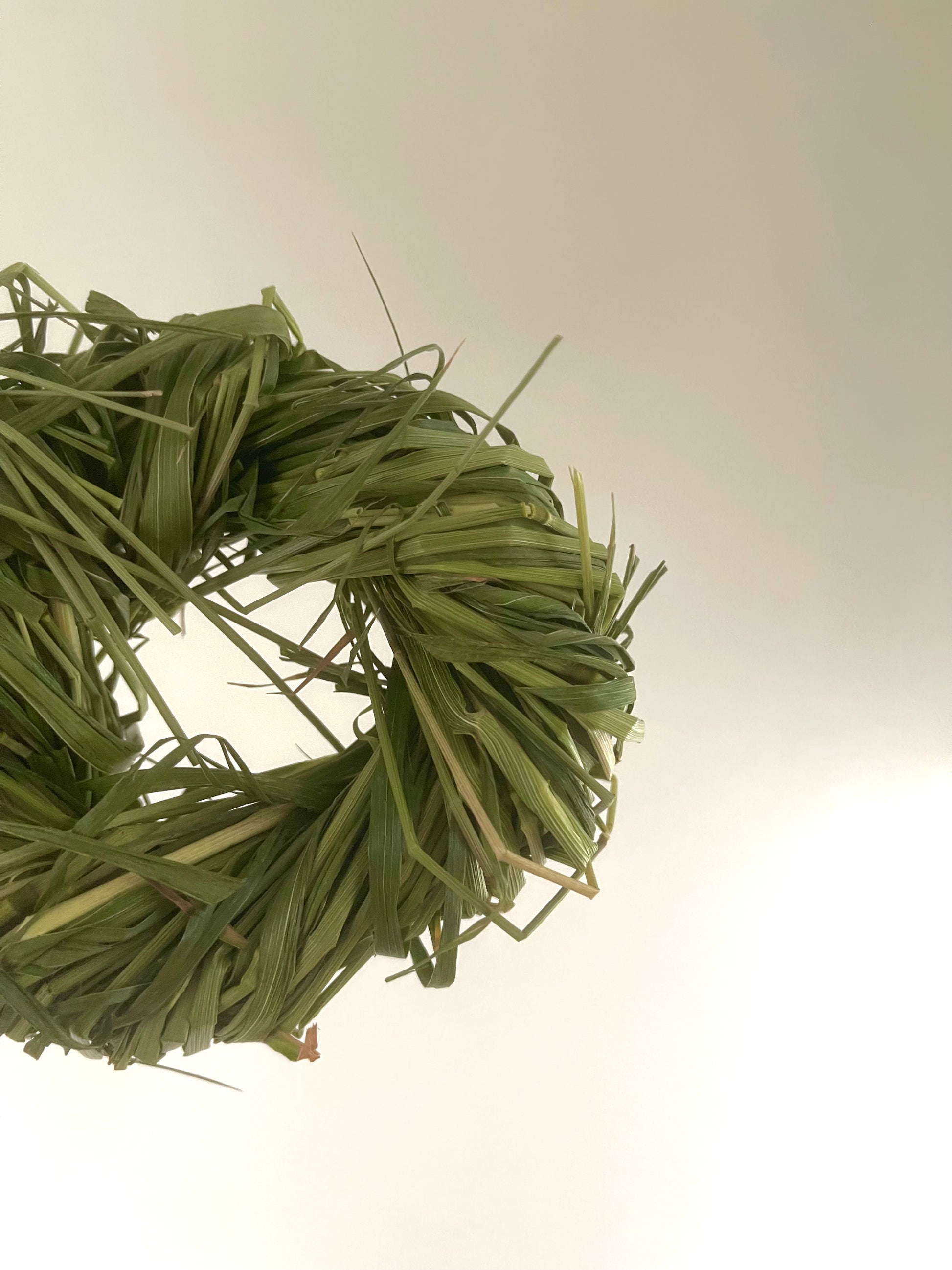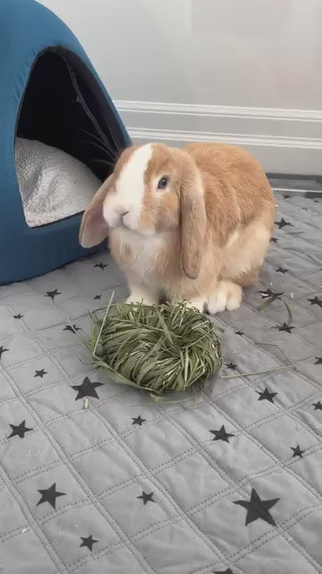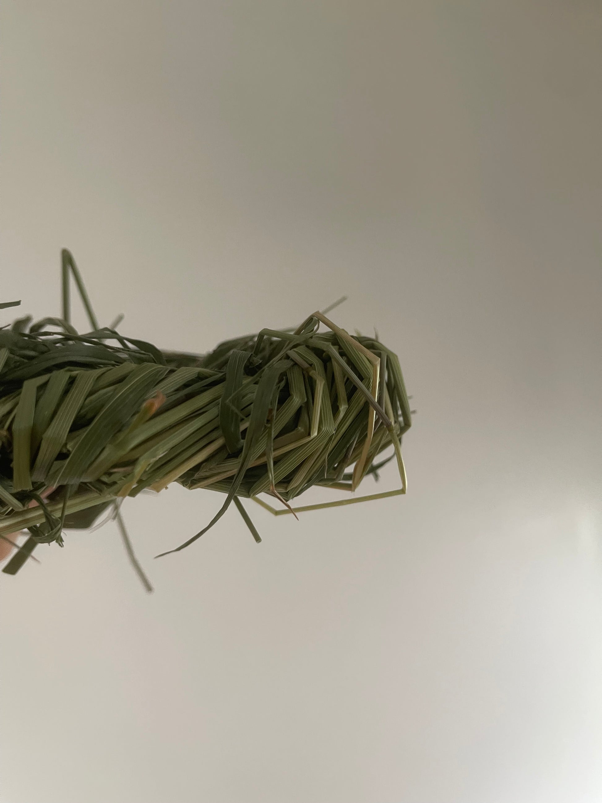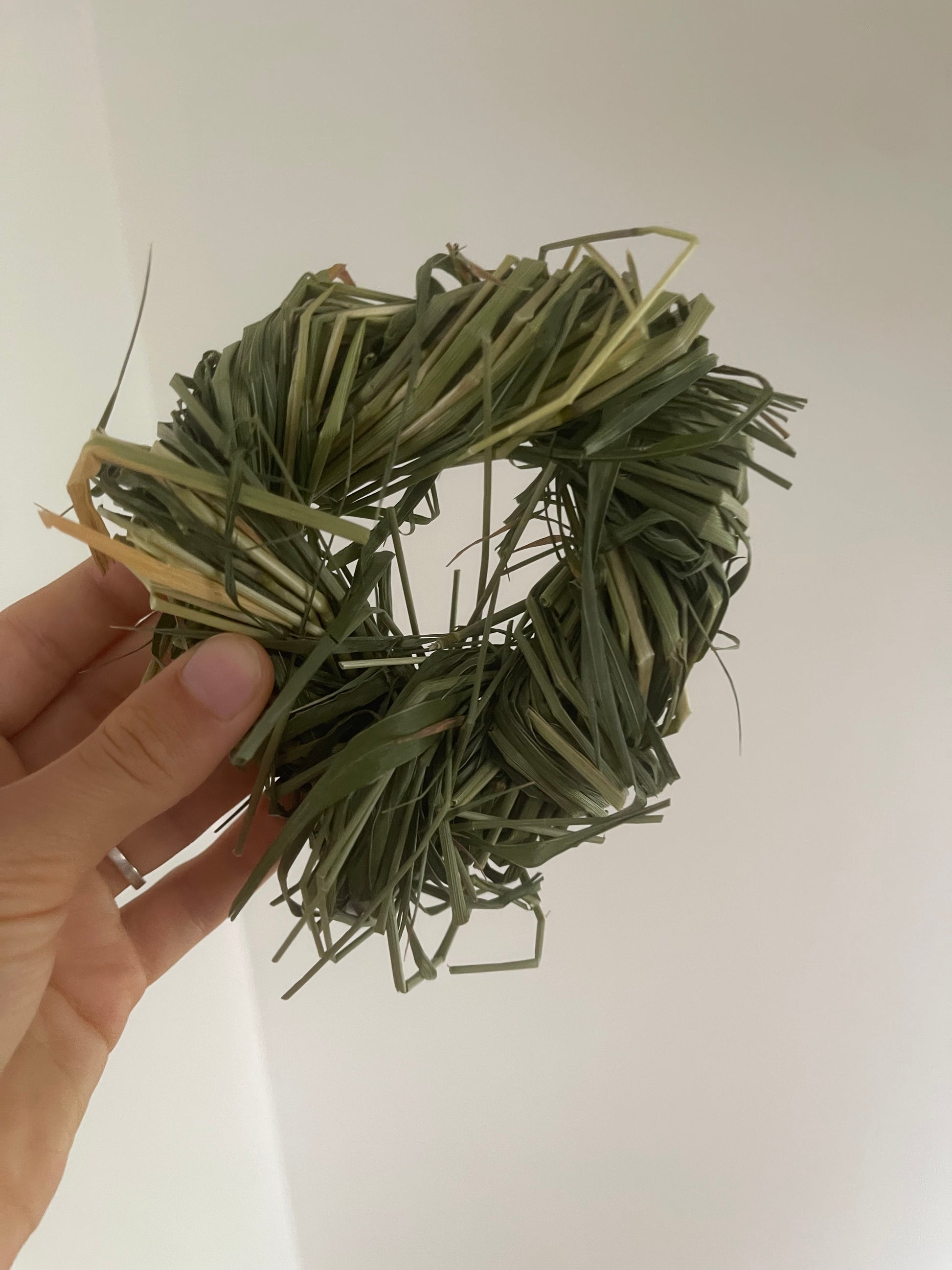 Un petit plaisir 100 % naturel pour votre lapin! Cet anneau est confectionné à la main avec du foin de dactyle cueilli soigneusement au Québec. Riche en fibres, il favorise la digestion tout en aidant à l’usure des dents. À grignoter ou à lancer : un jouet comestible simple et sain!