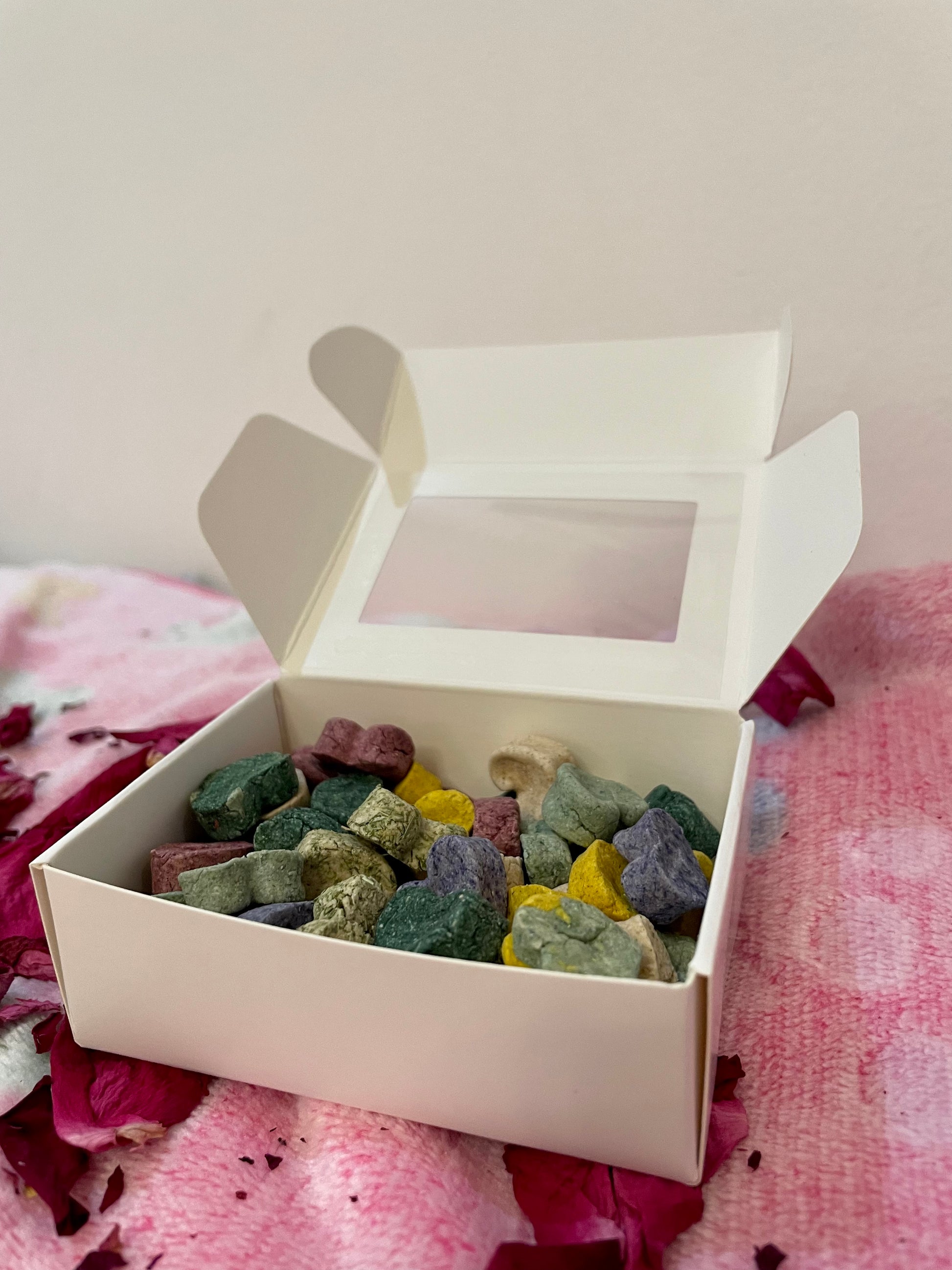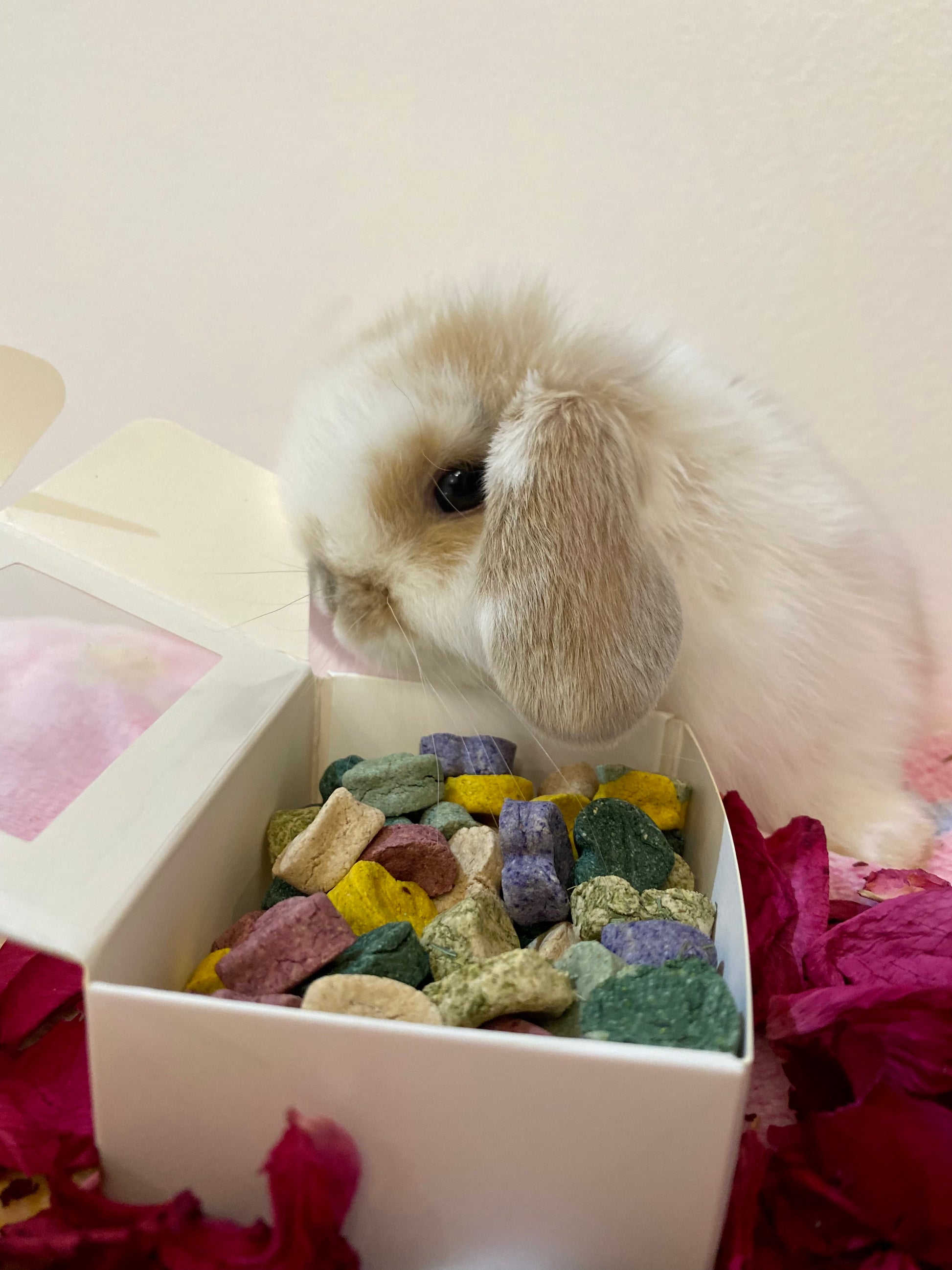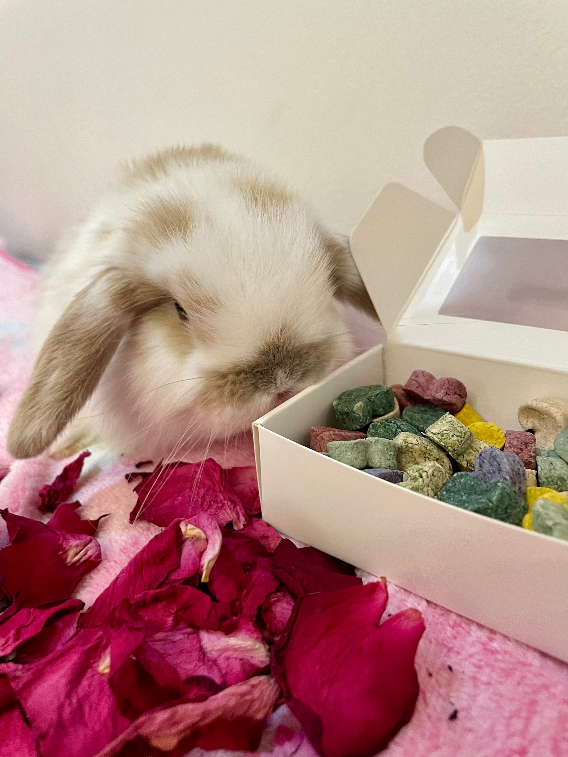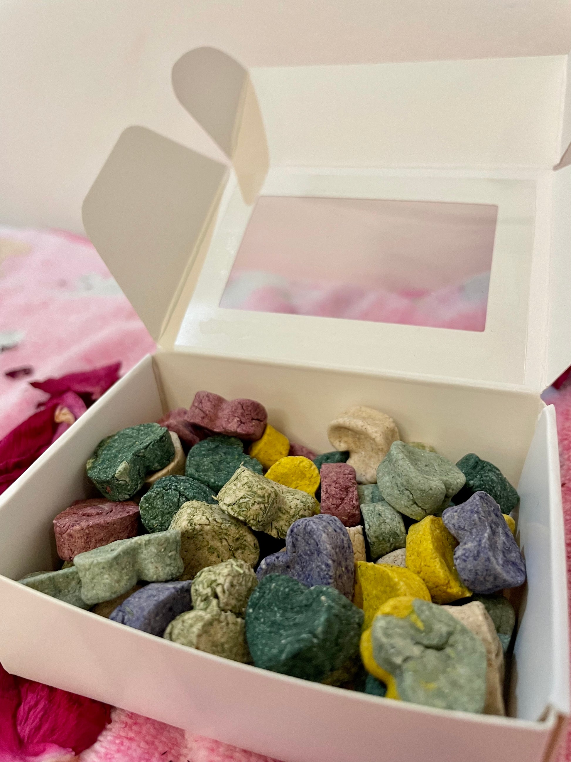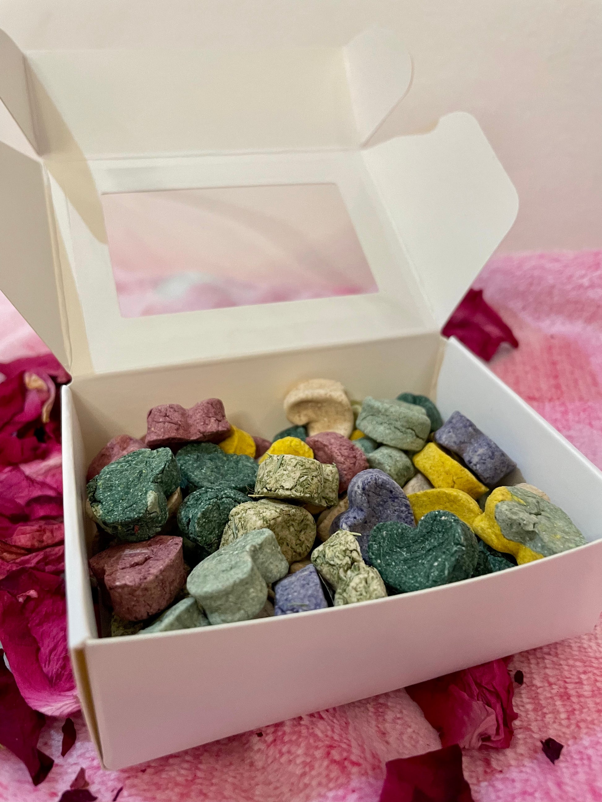 These bite-sized treats, perfectly sized for bunnies, are crafted with organic barley, organic banana, organic hibiscus, organic turmeric, organic pea flowers, organic spirulina, and organic grass. Each bite offers a tasty fusion of essential nutrients, promoting vitality and well-being. Hibiscus brings antioxidants, turmeric provides anti-inflammatory properties, spirulina contributes to nutritional needs, and grass stimulates digestion. Treat your small companion to these heart-shaped delights, a delicious and beneficial experience. These treats offer a vibrant palette of flavors to delight your little friends! Suitable for rabbits and other small animals.