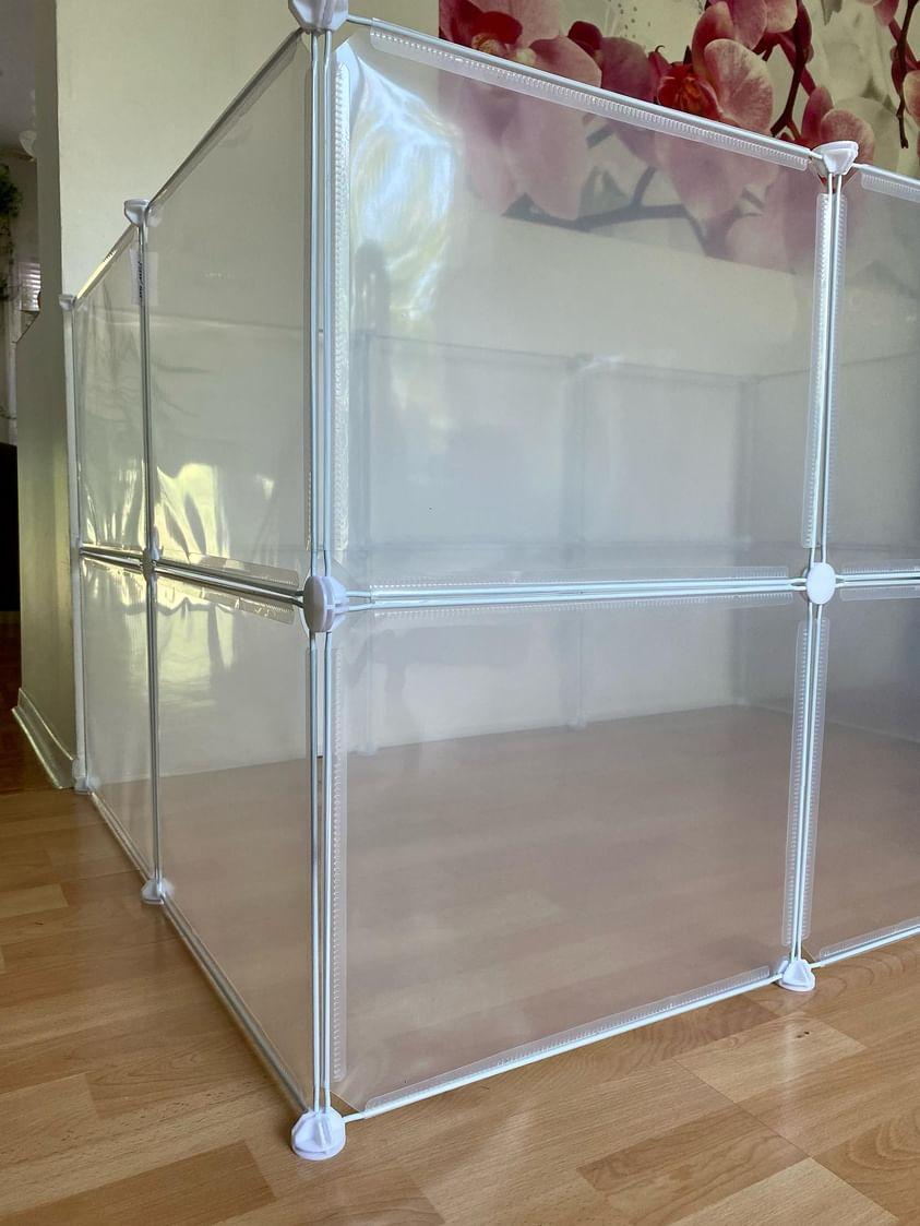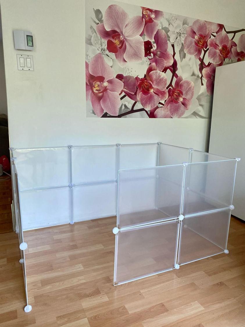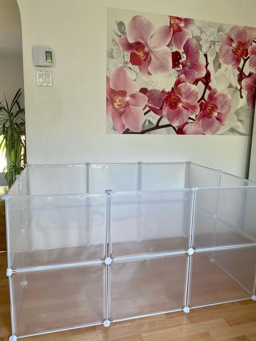Transparent Enclosure with 20 Panels fir bunny. The ideal solution to provide your bunny with a secure and customizable space. Assembling this playpen is a piece of cake, thanks to its simple and clever design, and you have the freedom to adjust its size and opening as needed. The transparency of the panels allows for easy monitoring while ensuring the safety of your pet.