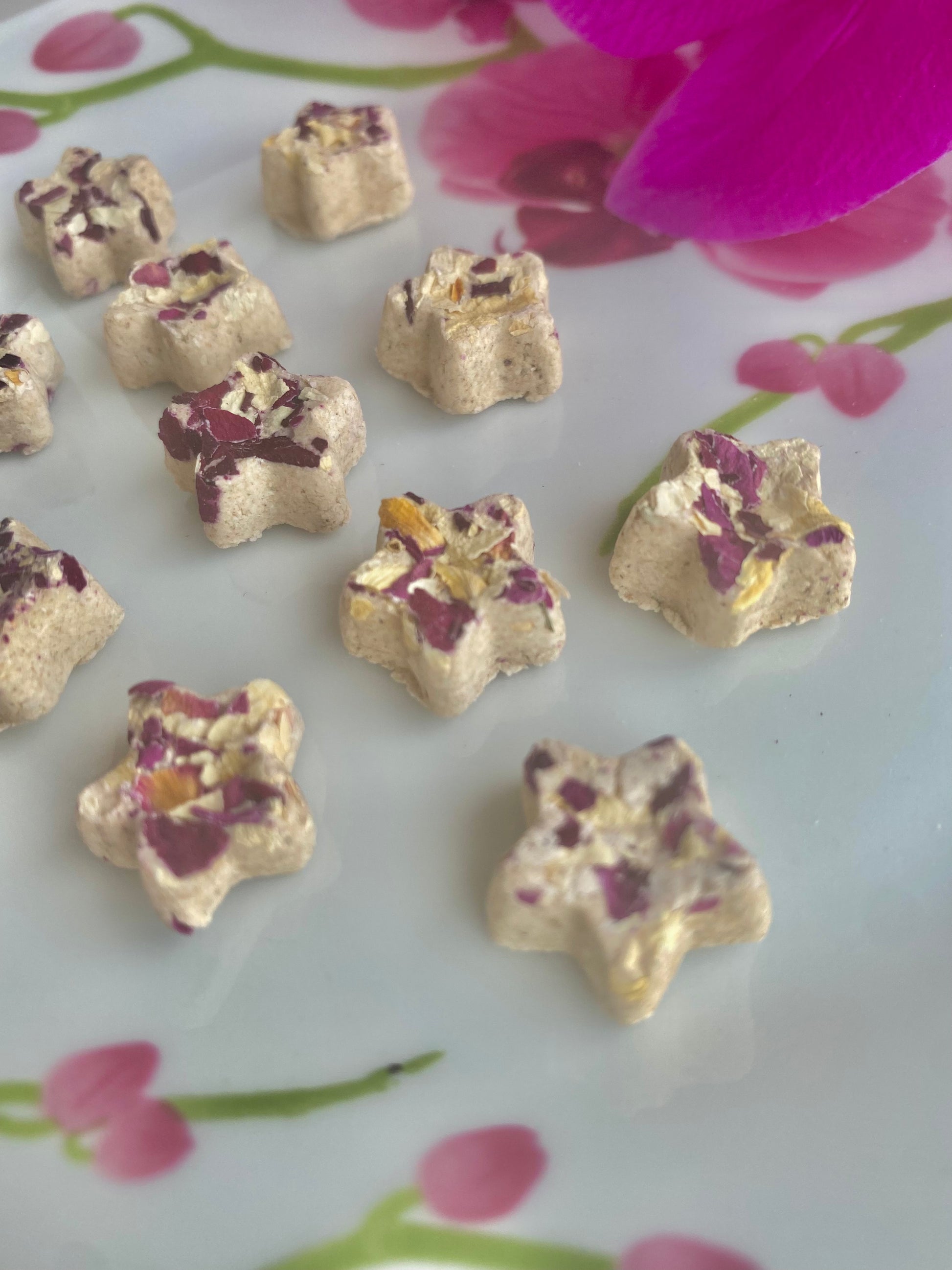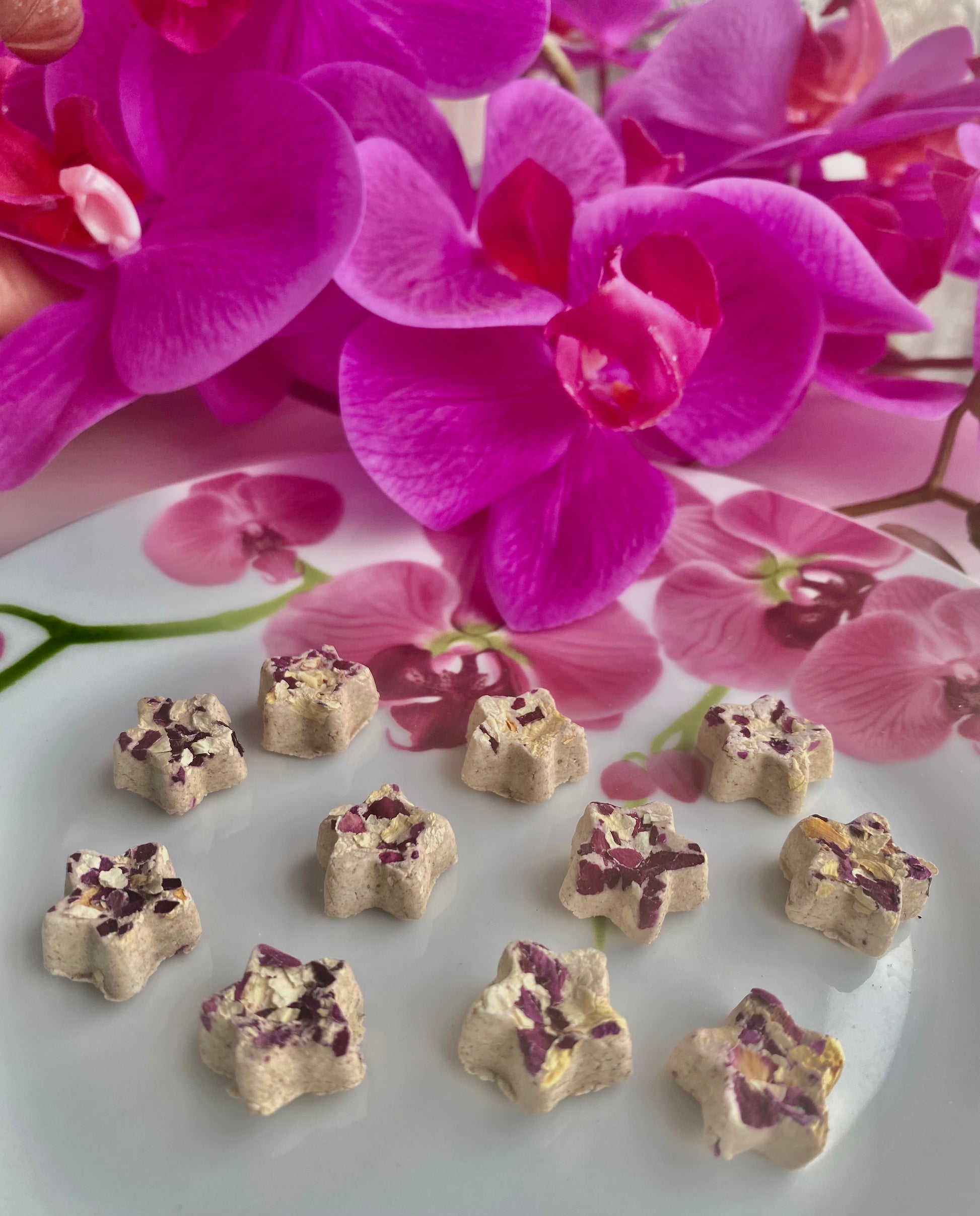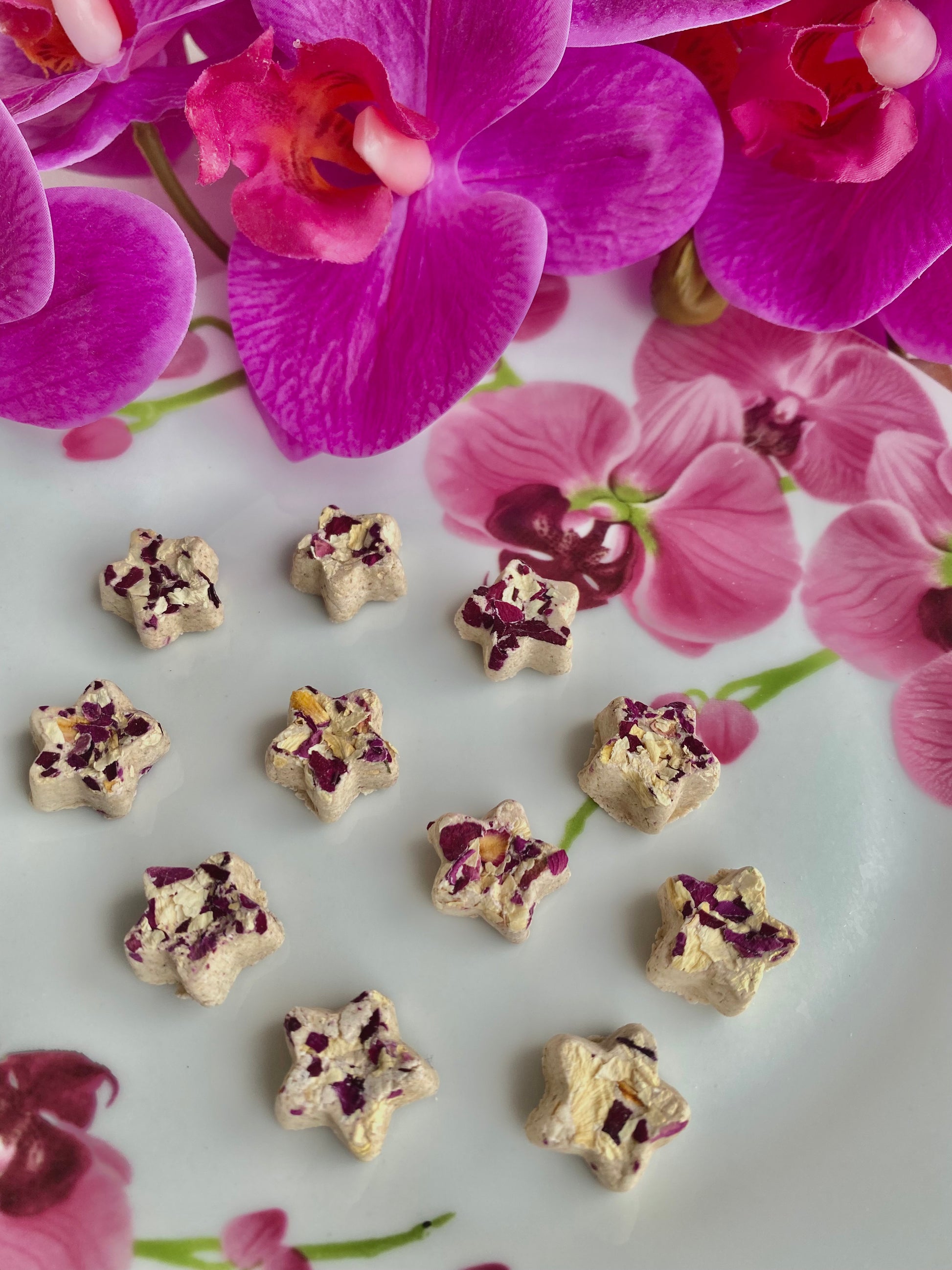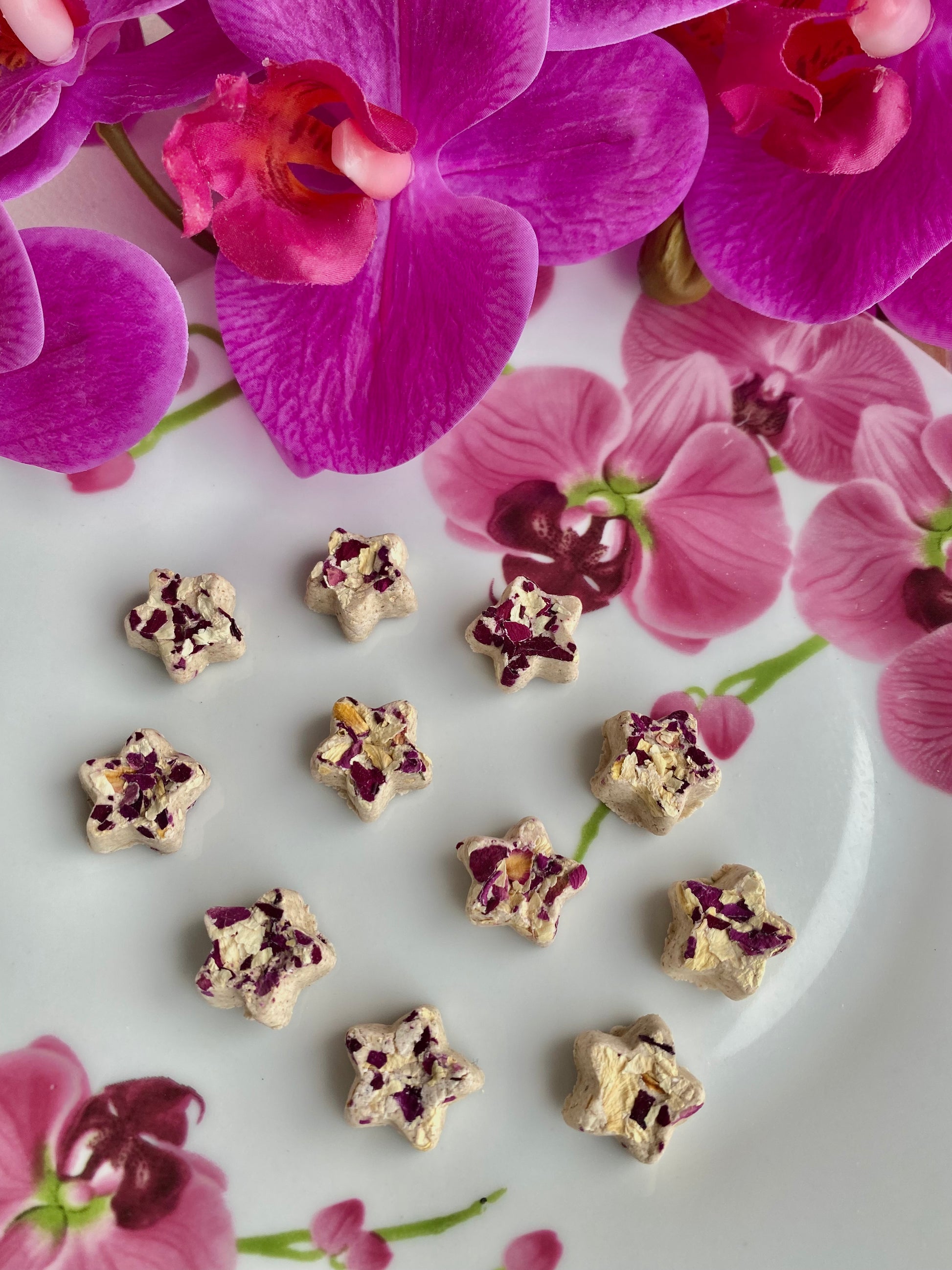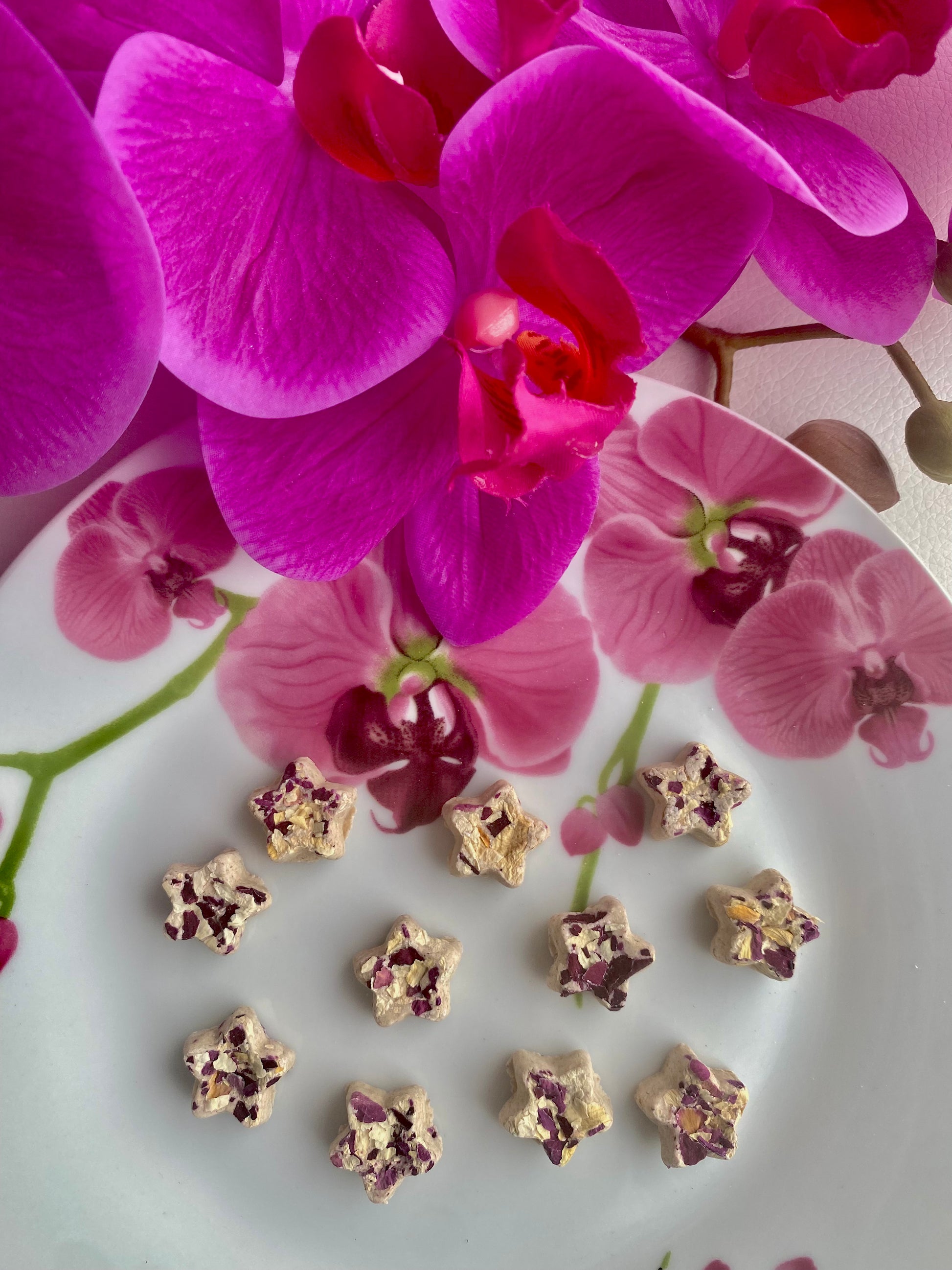 Made of organic salad (grown in our greenhouse) and pink/white rose petals, these treats are as wholesome as they are adorable. 🌹🌿