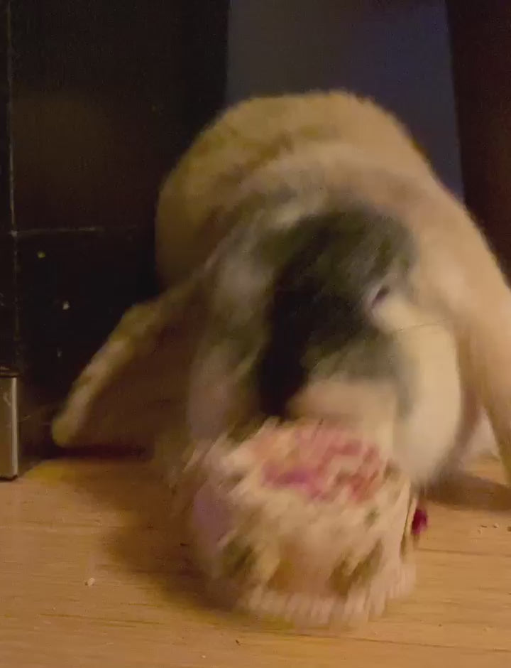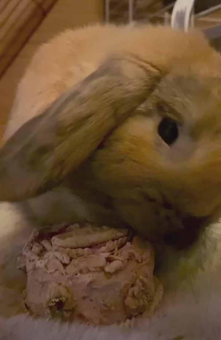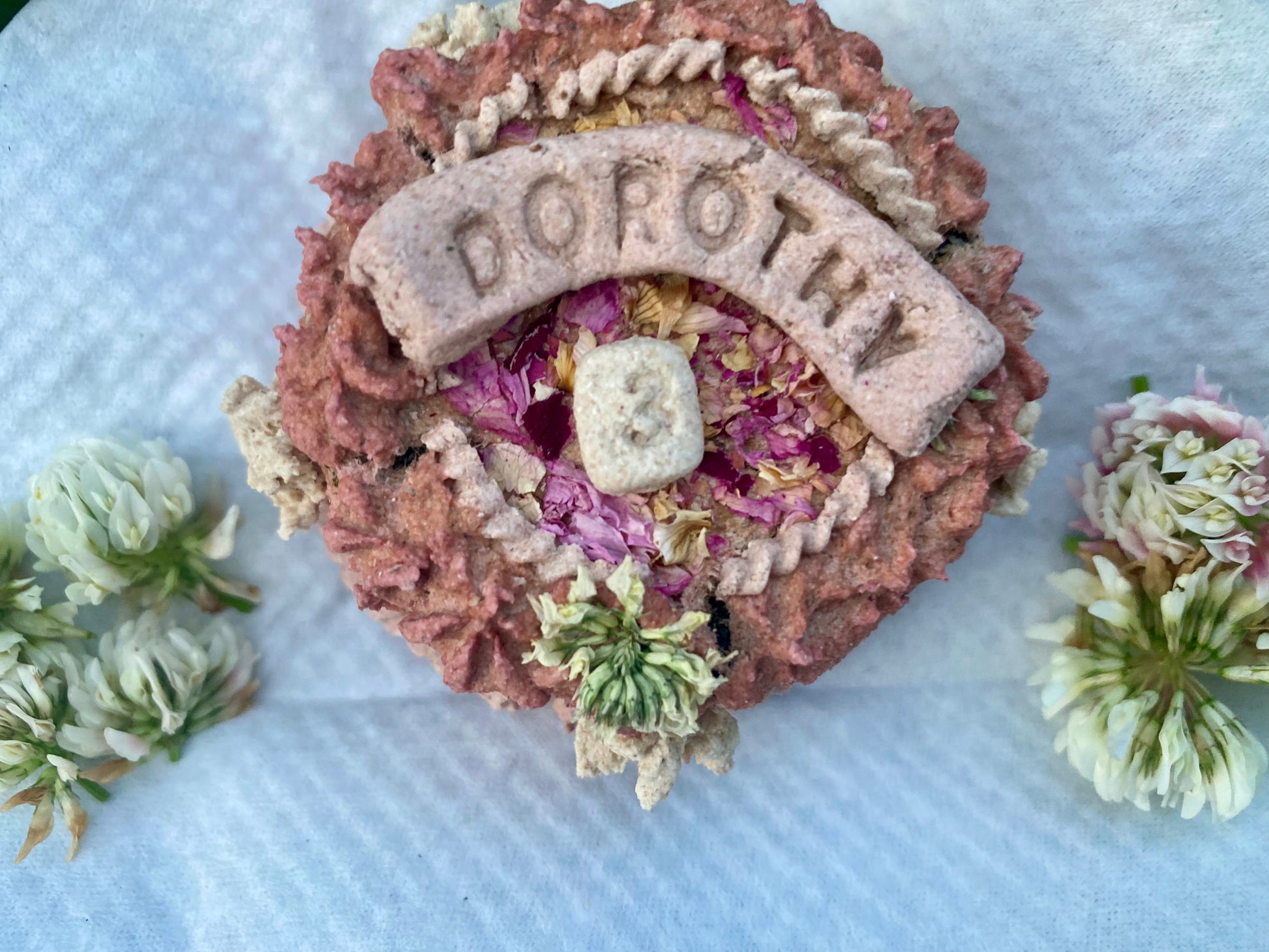 Custom bunny birthday cake, completely organic. The name on the cake as well as the age are personalized. The cake is perfect for celebrating your bunny's birthday or Gotcha day. The interior is made of 100% compressed fresh grass and a little bit of strawberry icing.