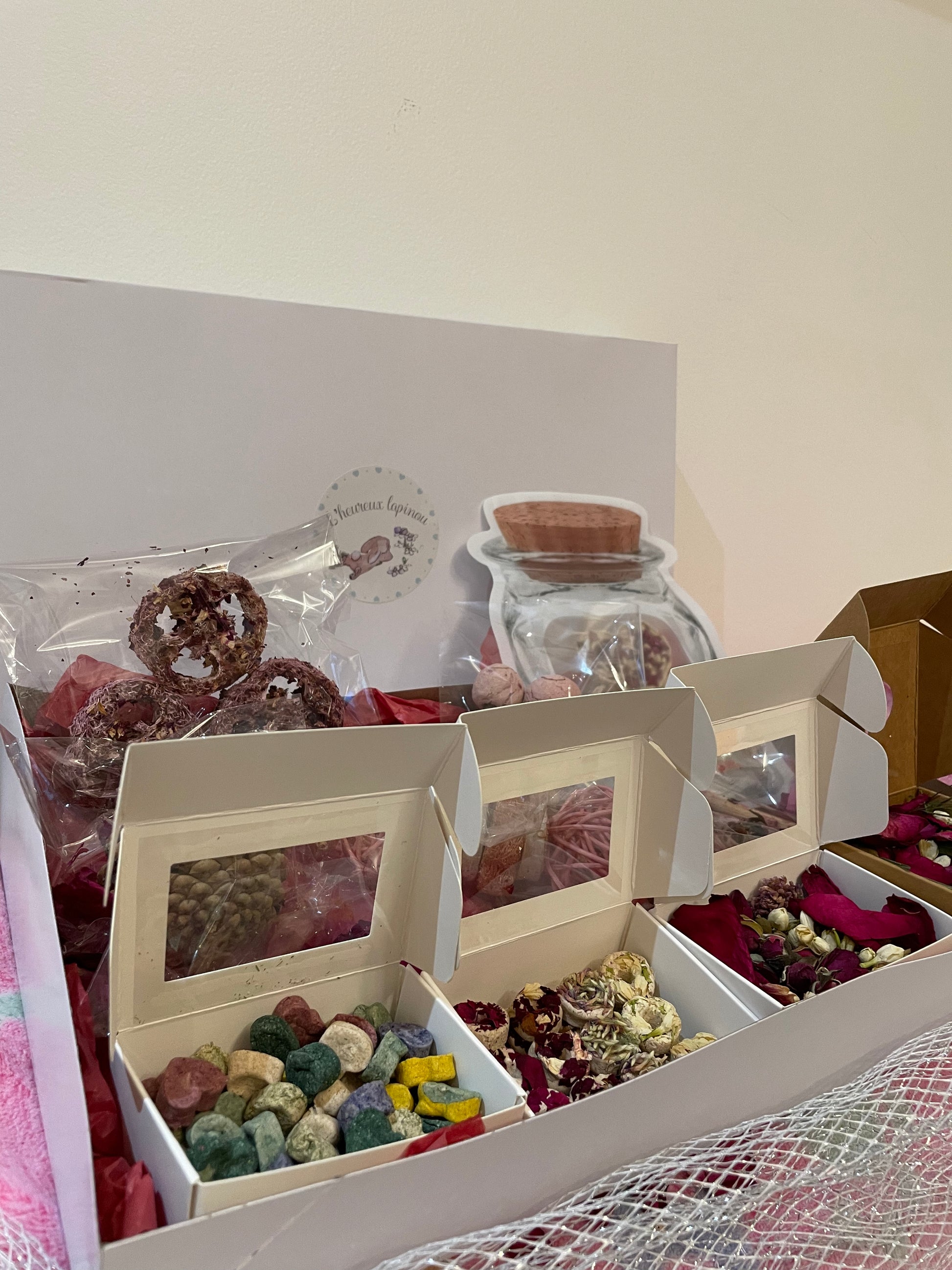 - 50 small heart-shaped treats with flavors of pea flower, hibiscus, banana, grass, spirulina, and curcuma