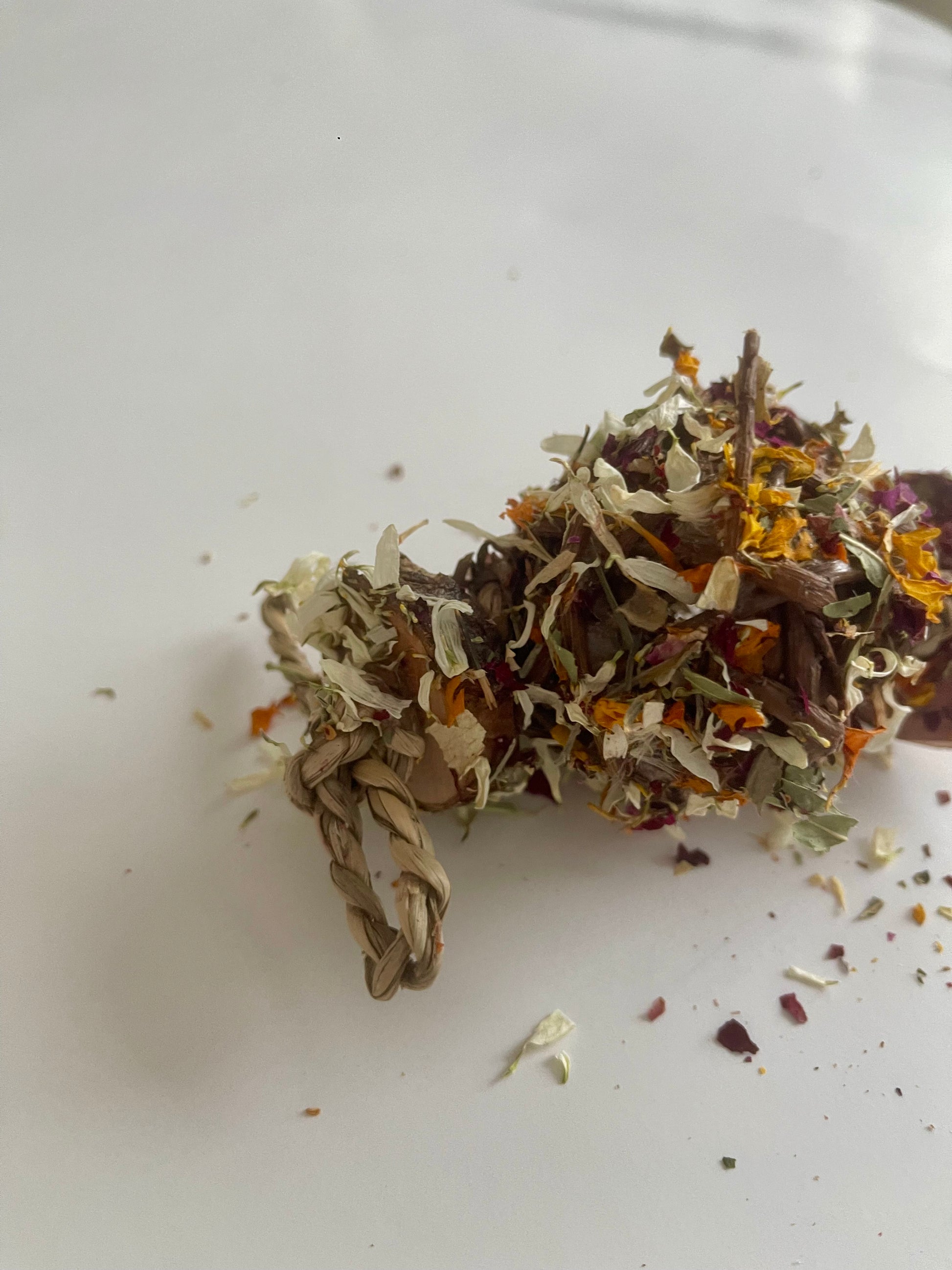 Vine ball, apple wood slices, and seagrass delicately flavored with banana and topped with hand-picked wildflowers from Quebec. A true natural feast for your bunny.