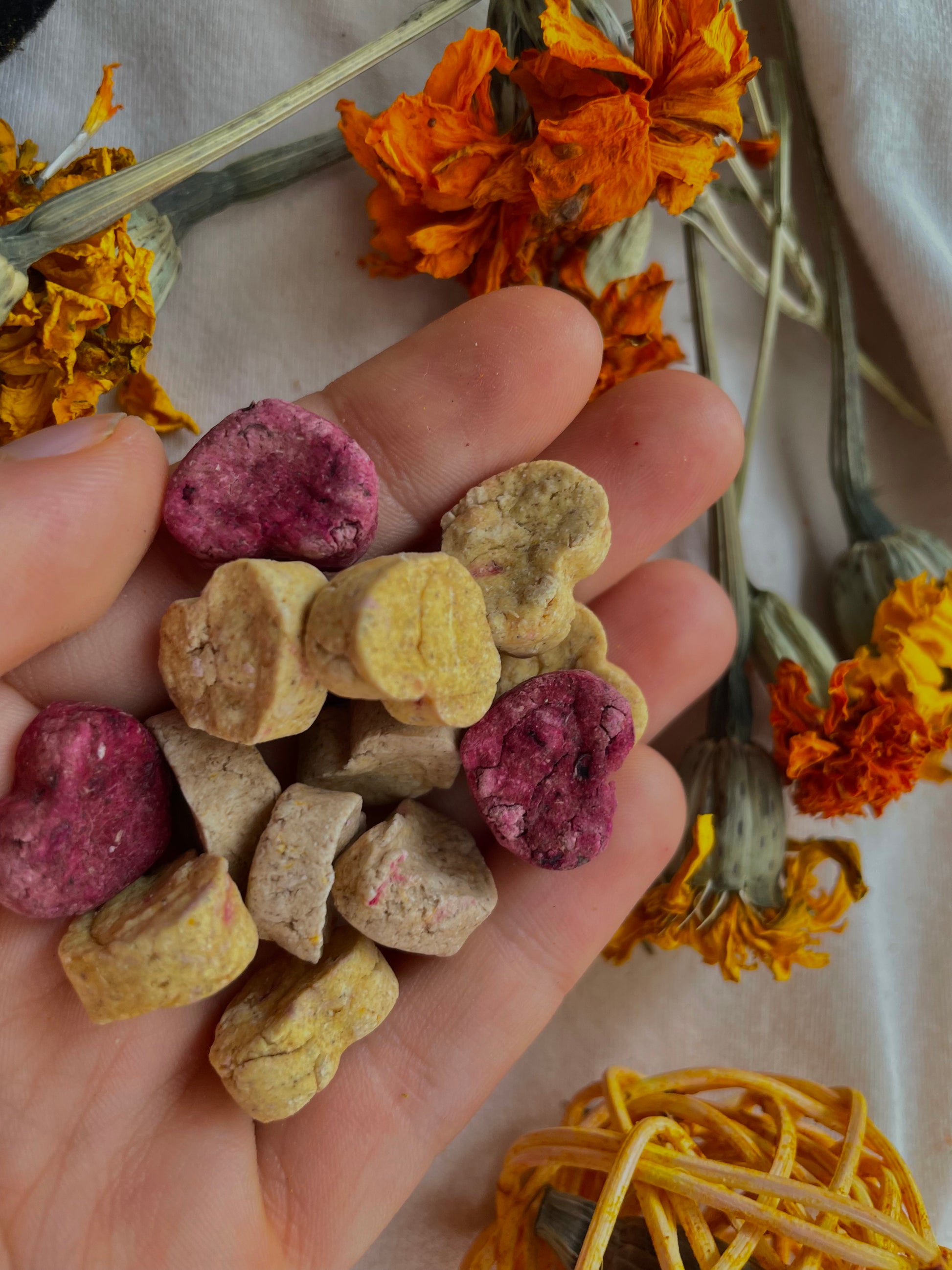 Les coeurs d’automne sont de petites gourmandises artisanales pour lapins (ou autres petits animaux), inspirées des saveurs de la saison. Ces petites friandises sont confectionnées avec soin en utilisant des ingrédients naturels comme la citrouille et la betterave. Sans sucre ni additifs, elles offrent une explosion de couleurs automnales – rouge, orange, jaune et beige – pour éveiller les papilles de votre lapin tout en célébrant les saveurs de l’automne.